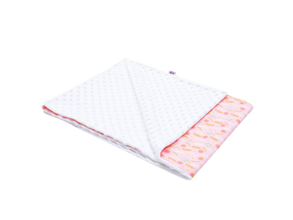 Nádherna detská deka New Baby. Deka je vyrobená z dvoch typov tkanín. Prvá je veľmi mäkká a na dotyk príjemná, hebká Minky látka s výstupkami pre stimuláciu senzomotoriky a druhá je 100% bavlna s originálnymi obrázkami a vzormi, ktoré pomáhajú deťom učiť sa nové veci a rozvíjať ich fantáziu. Je ideálna ako pre bábätká od narodenia, tak pre väčšie deti. Deku môžete používať ako doma, tak vonku, v kočíku, postieľke, autosedačke či ako hraciu deku. Je vyrobená z veľmi kvalitného materiálu, ktorý nepúšťa farbu a nevyvoláva alergické reakcie.