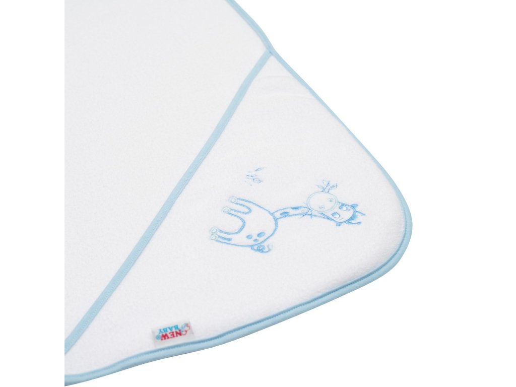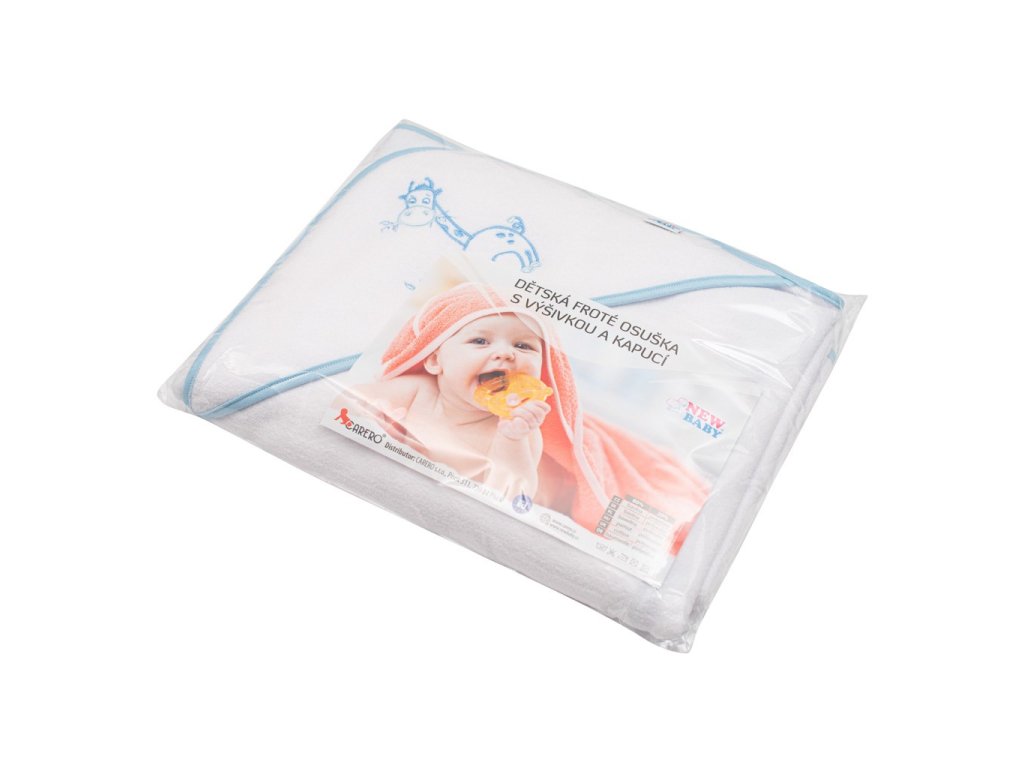 Krásna detská froté osuška New Baby je vyrobená z mäkkého, kvalitného a veľmi savého materiálu a preto je ideálna pre bábätká i staršie deti. Osuška krásne zahreje po kúpeli a praktická kapucňa chráni hlavičku dieťatka pred nepríjemným chladom. Osuška dokonale absorbuje vlhkosť, pričom veľmi rýchlo schne. Zdobí ju veselý obrázok zvieratka. P> Zloženie: 80% bavlna, 20% polyester