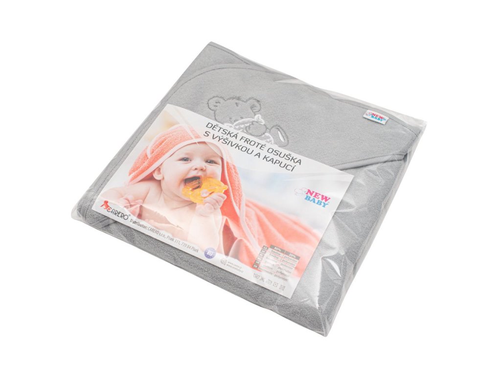 Krásna detská froté osuška New Baby je vyrobená z mäkkého, kvalitného a veľmi savého materiálu a preto je ideálna pre bábätká i staršie deti. Osuška krásne zahreje po kúpeli a praktická kapucňa chráni hlavičku dieťatka pred nepríjemným chladom. Osuška dokonale absorbuje vlhkosť, pričom veľmi rýchlo schne. Zdobí ju veselý obrázok zvieratka. P> Zloženie: 80% bavlna, 20% polyester