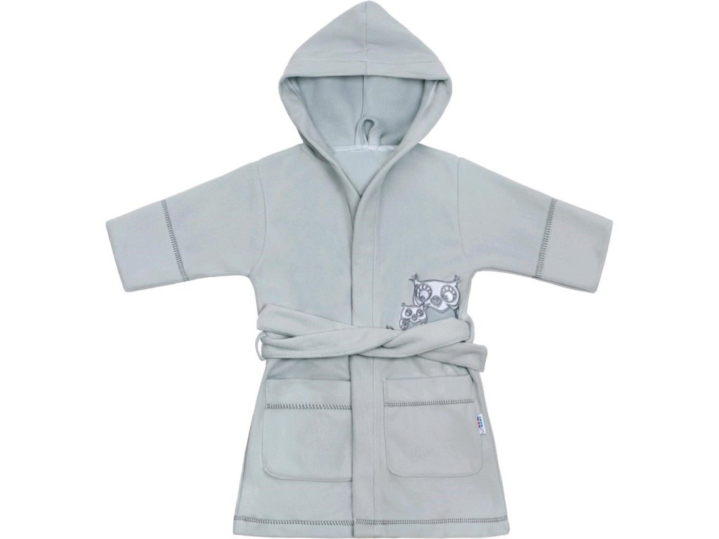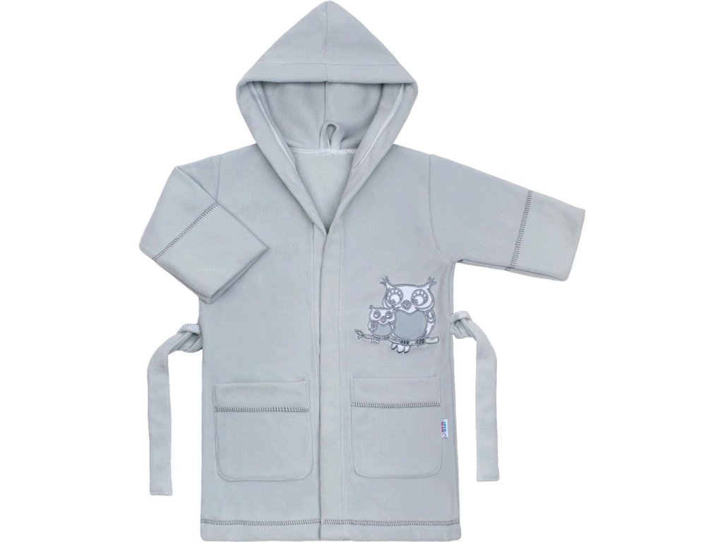 Detský župan New Baby Sovičky. Župan zdobí obrázok sovičiek, kapucňa a dve vrecká. Kapucňa chráni mokrú hlavičku pred chladom a mäkký, teplý materiál je ideálny pre citlivú detskú pokožku. Detský župan sa zaväzuje na šnúrky. Rozmer: dĺžka od ramienok cca 61 cm, obvod okolo hrudníka cca 80 cm, dĺžka rukáva cca 33 cm. Zloženie 100% polyester.Dodatočné parametre