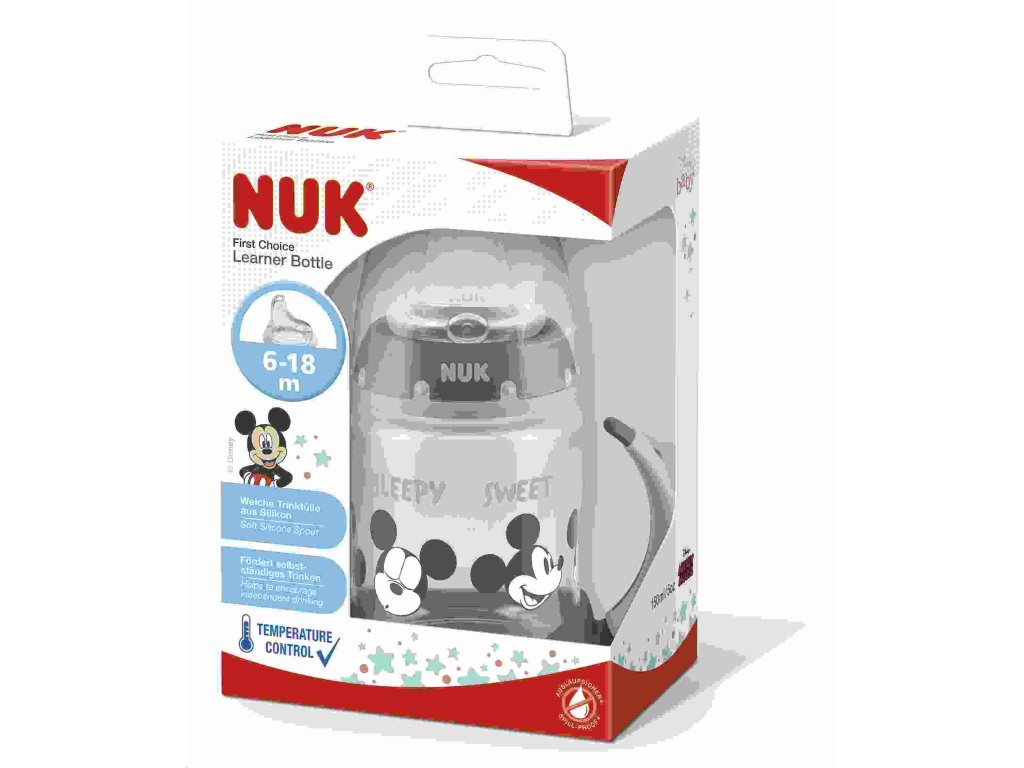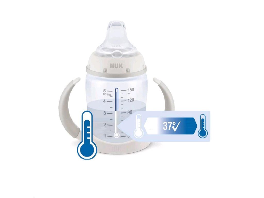 Dojčenská fľaša na učenie NUK First Choice s indikátorom teploty. Zabudovaný indikátor kontroly teploty zmení farbu, ak je obsah fľašky príliš horúci. Modrá farba indikátora sa zmení na bielu. Fľaštička bábätkám uľahčuje prechod od dojčenia alebo kŕmenia k samostatnému pitiu. Dojčenská fľaša má mäkké silikónové nekvapkajúci náustok a nemusíte sa báť vyliatia obsahu. Je ergonomicky tvarovaná a má protišmykové držadlá, takže si dieťa môže fľašu držať samo napríklad aj pri jazde v kočíku. Výhodou tejto super fľaštičky je, že sa ľahko rozoberie a čistí. Vyrobená z vysoko kvalitného plastu polypropylénu a neobsahuje BPA (Bisfenol A). Vhodné pre deti od 6 do 18 mesiacov. Balenie obsahuje:- fľaštička s náustkom 150 ml