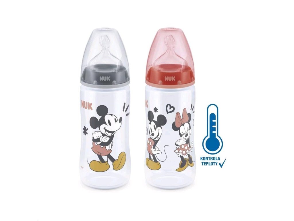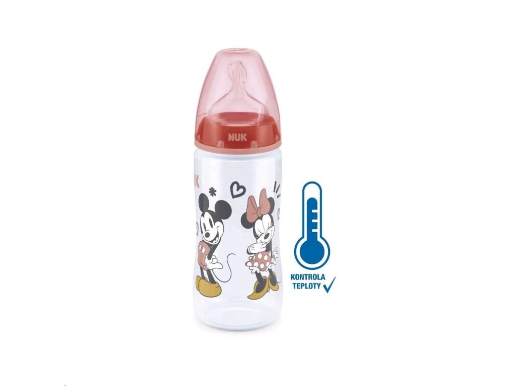 Dojčenská fľaša na učenie NUK First Choice s indikátorom teploty. Zabudovaný indikátor kontroly teploty zmení farbu, ak je obsah fľašky príliš horúci. Modrá farba indikátora sa zmení na bielu. Fľaštička bábätkám uľahčuje prechod od dojčenia alebo kŕmenia k samostatnému pitiu. Dojčenská fľaša má mäkké silikónové nekvapkajúci náustok a nemusíte sa báť vyliatia obsahu. Je ergonomicky tvarovaná a má protišmykové držadlá, takže si dieťa môže fľašu držať samo napríklad aj pri jazde v kočíku. Výhodou tejto super fľaštičky je, že sa ľahko rozoberie a čistí. Vyrobená z vysoko kvalitného plastu polypropylénu a neobsahuje BPA (Bisfenol A). Vhodné pre deti od 6 do 18 mesiacov, veľkosť M. Balenie obsahuje:- fľaštička s náustkom 300 ml