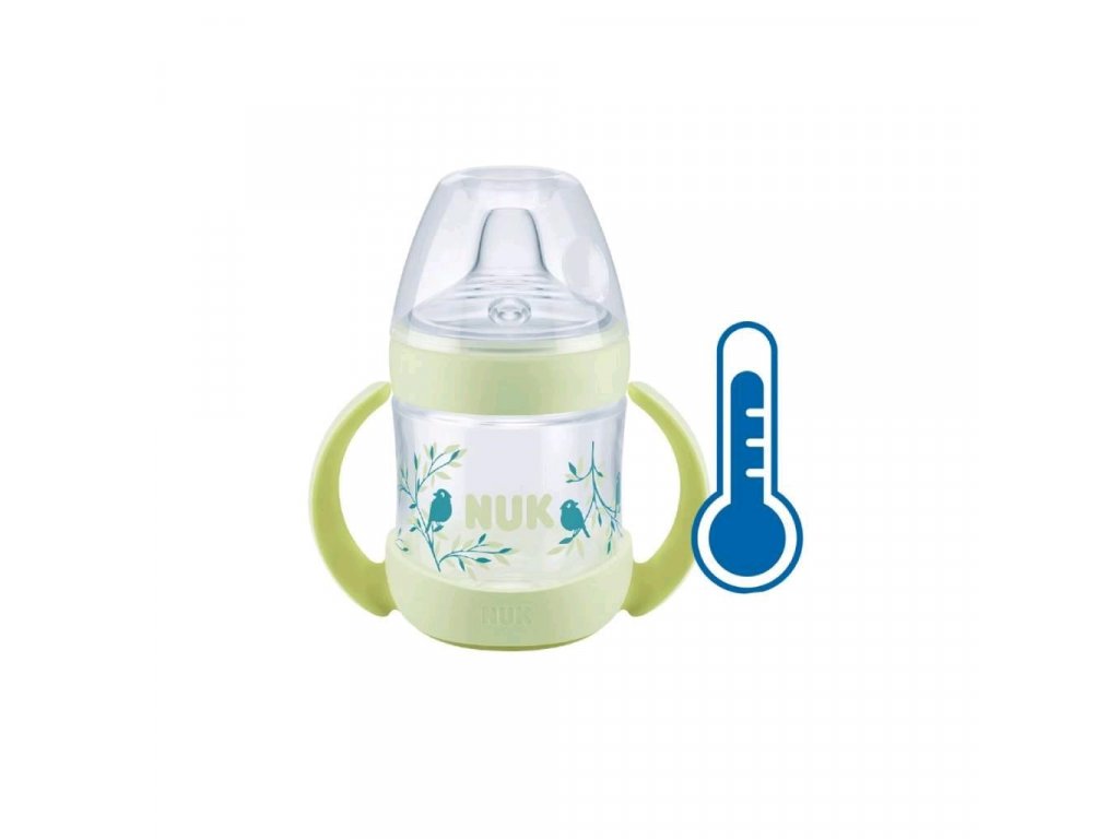 Dojčenská fľaša na učenie NUK Nature Sense 150 ml s indikátorom teploty. Zabudovaný indikátor kontroly teploty zmení farbu, ak je obsah fľašky príliš horúci. Modrá farba indikátora sa zmení na bielu. Je ergonomicky tvarovaná, má protišmykové dno pre stabilitu fľaštičky a protišmykové držadlá, takže si dieťa môže fľašu držať samo napríklad aj pri jazde v kočíku. Inovatívny antikolikový ventil navyše umožňuje neprerušované pitie pripomínajúce dojčenie a zabraňuje prehĺtaniu vzduchu. Nekvapkajúci náustok zaručuje prepravu bez vyliatia, takže sa fľaštička na učenie môže stať vaším verným spoločníkom na cestách. Výhodou tejto super fľaštičky je, že sa ľahko rozoberie a čistí. Vyrobená z vysoko kvalitného plastu polypropylénu a neobsahuje BPA (Bisfenol A). Vhodné pre deti od 6 do 18 mesiacov. Klinicky testované. Balenie obsahuje:- fľaštička s náustkom 150 ml