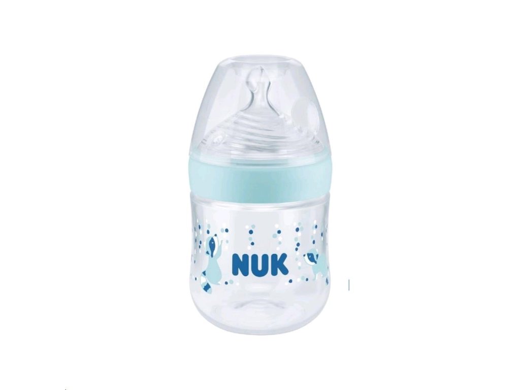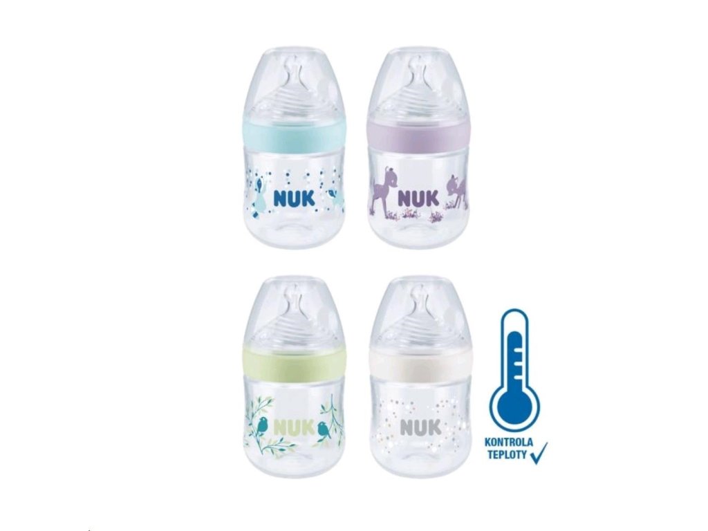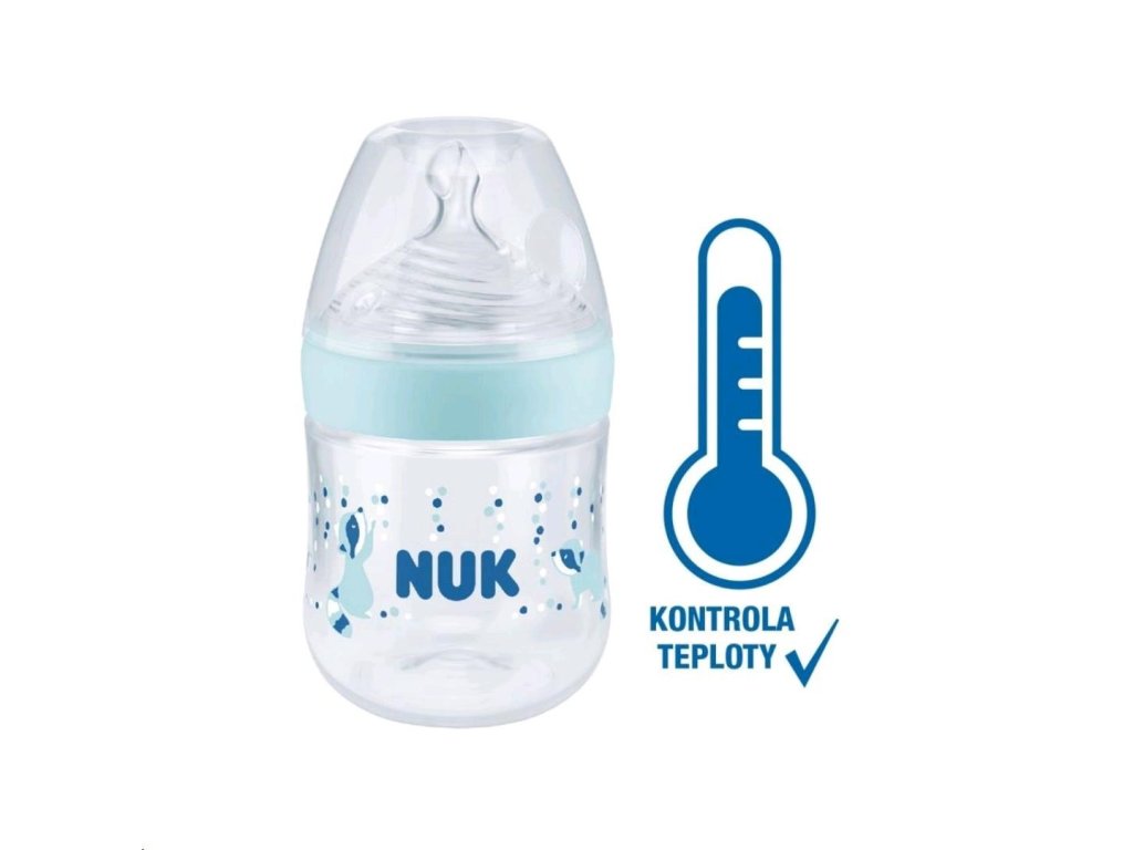 Dojčenská fľaša Nuk Nature Sense S-small 150 ml s indikátorom teploty. Zabudovaný indikátor kontroly teploty zmení farbu, ak je obsah fľašky príliš horúci. Modrá farba indikátora sa zmení na bielu. Fľaštička bábätkám uľahčuje prechod od dojčenia alebo kŕmenia k samostatnému pitiu. Dojčenská fľaša Nature Sense má silikónový cumlík, ktorý je podľa tvaru aj mäkkosti najviac podobný prsníku matky. Fľaštička je tak prirodzená ako je to len možné. Má extra široké hrdlo na jednoduché plnenie aj čistenie, ochranné nepriepustné viečko, mäkký a pružný cumlík, ktorý je odolný voči teplu i opotrebovaniu bez vône i chuti. Fľaštička je vyrobená z vysoko kvalitného polypropylénového materiálu bez BPA. Špeciálny tvar typický pre cumlíky NUK s ortodontickým antikolikovým cumlíkom je modelovaný podľa materskej bradavky pri dojčení. Ponecháva dostatok priestoru pre prirodzené sacie pohyby jazyka aj čeľuste. Vylepšený systém proti prehĺtaní vzduchu pri pití Anti Colic Air Systém zabezpečuje prirodzený tok mlieka, aby dieťa pilo uvoľnene bez prehĺtaní vzduchu. Fľaštička je odporúčaná pôrodnými asistentkami a pediatrami. Charakteristika cumlíka:- mäkký a pružný, aby prispôsobil svoj tvar detským ústam rovnako ako bradavka