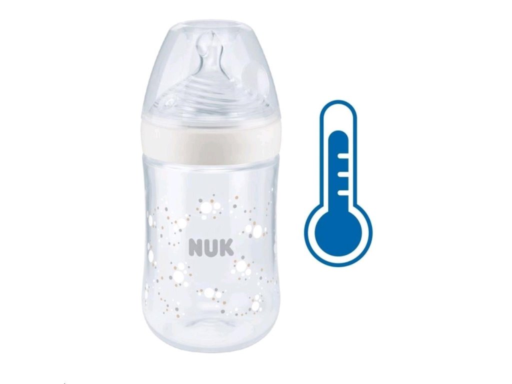Dojčenská fľaša Nuk Nature Sense M, 260 ml s indikátorom teploty. Zabudovaný indikátor kontroly teploty zmení farbu, ak je obsah fľašky príliš horúci. Modrá farba indikátora sa zmení na bielu. Fľaštička bábätkám uľahčuje prechod od dojčenia alebo kŕmenia k samostatnému pitiu. Dojčenská fľaša Nature Sense má silikónový cumlík, ktorý je podľa tvaru aj mäkkosti najviac podobný prsníku matky. Fľaštička je tak prirodzená ako je to len možné. Má extra široké hrdlo na jednoduché plnenie aj čistenie, ochranné nepriepustné viečko, mäkký a pružný cumlík, ktorý je odolný voči teplu i opotrebovaniu bez vône i chuti. Fľaštička je vyrobená z vysoko kvalitného polypropylénového materiálu bez BPA. Špeciálny tvar typický pre cumlíky NUK s ortodontickým antikolikovým cumlíkom je modelovaný podľa materskej bradavky pri dojčení. Ponecháva dostatok priestoru pre prirodzené sacie pohyby jazyka aj čeľuste. Vylepšený systém proti prehĺtaní vzduchu pri pití Anti Colic Air Systém zabezpečuje prirodzený tok mlieka, aby dieťa pilo uvoľnene bez prehĺtaní vzduchu. Fľaštička je odporúčaná pôrodnými asistentkami a pediatrami. Charakteristika cumlíka:- mäkký a pružný, aby prispôsobil svoj tvar detským ústam rovnako ako bradavka
