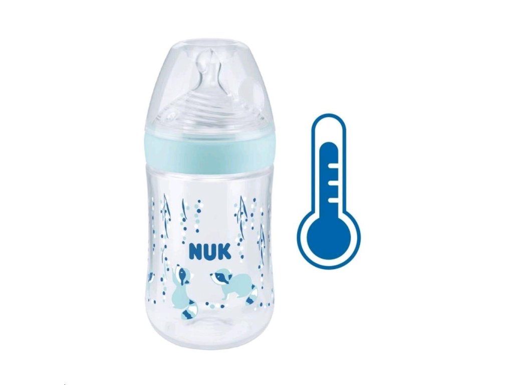 Dojčenská fľaša Nuk Nature Sense M, 260 ml s indikátorom teploty. Zabudovaný indikátor kontroly teploty zmení farbu, ak je obsah fľašky príliš horúci. Modrá farba indikátora sa zmení na bielu. Fľaštička bábätkám uľahčuje prechod od dojčenia alebo kŕmenia k samostatnému pitiu. Dojčenská fľaša Nature Sense má silikónový cumlík, ktorý je podľa tvaru aj mäkkosti najviac podobný prsníku matky. Fľaštička je tak prirodzená ako je to len možné. Má extra široké hrdlo na jednoduché plnenie aj čistenie, ochranné nepriepustné viečko, mäkký a pružný cumlík, ktorý je odolný voči teplu i opotrebovaniu bez vône i chuti. Fľaštička je vyrobená z vysoko kvalitného polypropylénového materiálu bez BPA. Špeciálny tvar typický pre cumlíky NUK s ortodontickým antikolikovým cumlíkom je modelovaný podľa materskej bradavky pri dojčení. Ponecháva dostatok priestoru pre prirodzené sacie pohyby jazyka aj čeľuste. Vylepšený systém proti prehĺtaní vzduchu pri pití Anti Colic Air Systém zabezpečuje prirodzený tok mlieka, aby dieťa pilo uvoľnene bez prehĺtaní vzduchu. Fľaštička je odporúčaná pôrodnými asistentkami a pediatrami. Charakteristika cumlíka:- mäkký a pružný, aby prispôsobil svoj tvar detským ústam rovnako ako bradavka