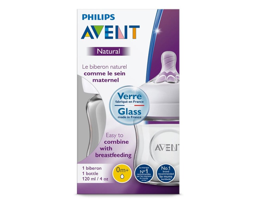 Sklenená dojčenská fľaštička Avent Natural 120 ml. Fľaštička je vhodná pre deti vo veku 0m +. Fľaša má silikónový cumlík. Obsah je 120 ml. K fľaštičke patrí silikónový cumlík s dierkou veľkosti 1-pomalý prietok a ochranný kryt. Neobsahuje BPA. Je kompatibilný s inými výrobkami Avent Natural.
