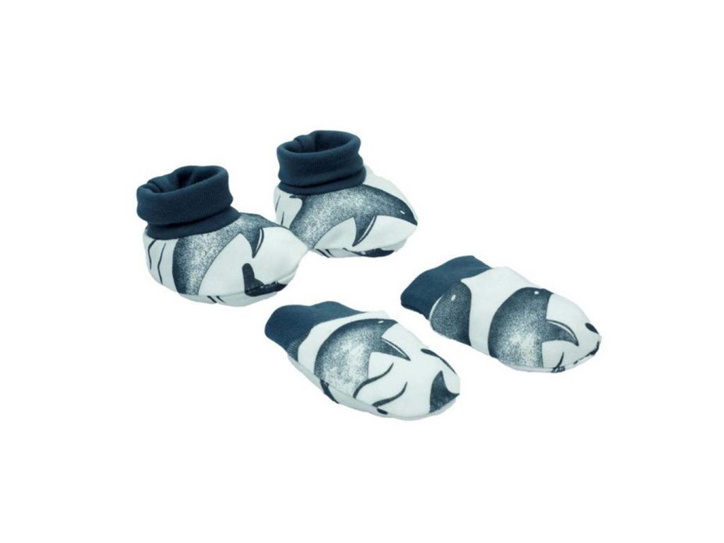 Krásny a praktický bavlnený set Nicol Dolphin. Set sa skladá z capačiek a rukavičiek. Capačky a rukavičky sú zdobené potlačou delfínov a majú sťahovacie manžetky. Fantázia v obliekaní nepozná hraníc a záleží len na vás, ako set doladíte s oblečením kolekcie Dolphin. Zloženie: 100% bavlna.